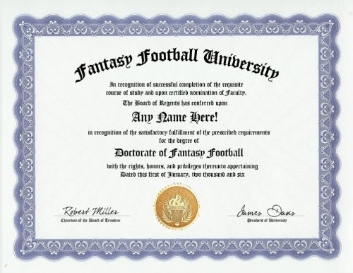 I highly recommendFantasy Football League Degree: Custom Gag Diploma Doctorate Certificate (Funny Customized Joke Gift - Novelty Item)